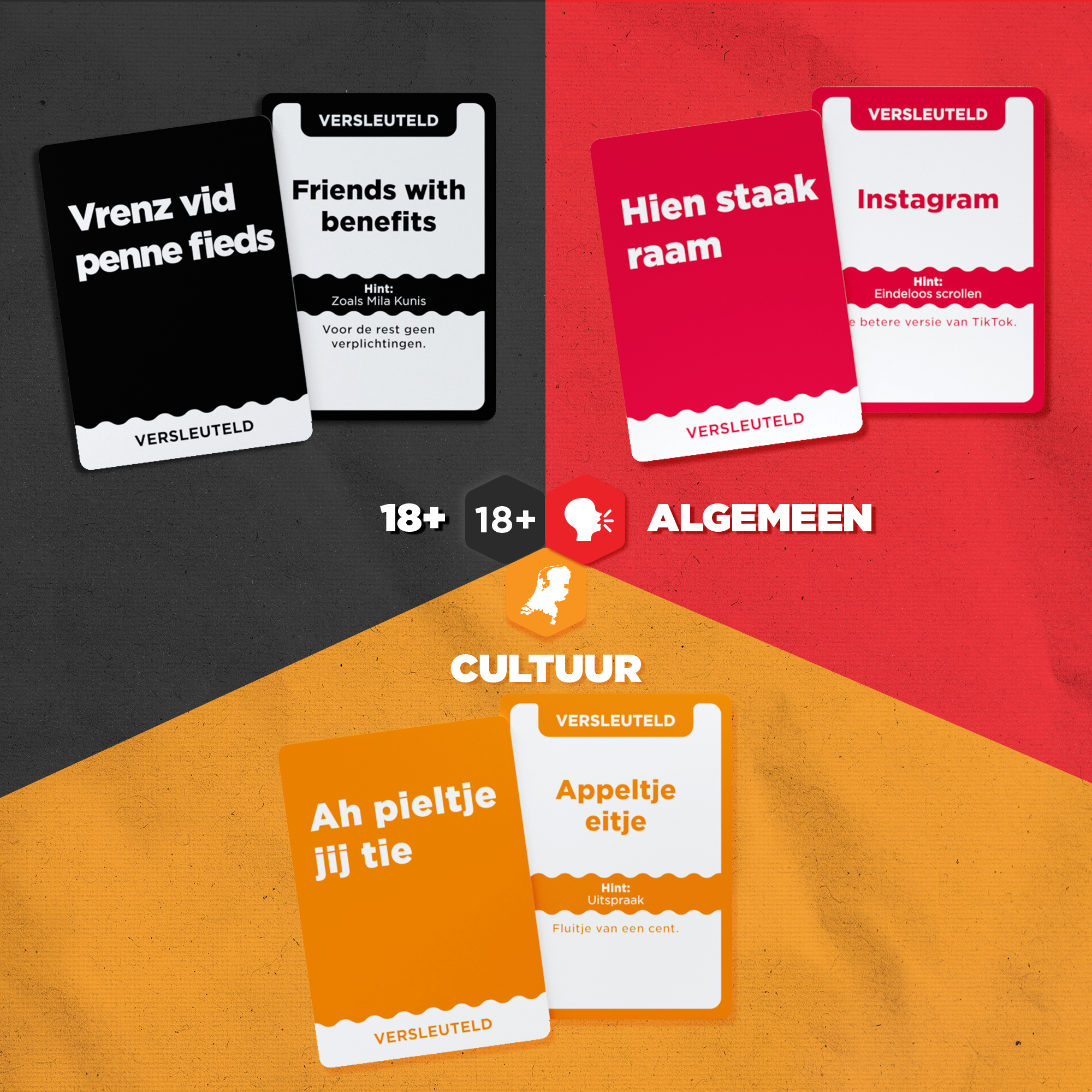 Kies tussen Nederlandse cultuur, Algemeen of 18+ (Volwassenen). Wissel de categorieën elke ronde om het fris te houden.